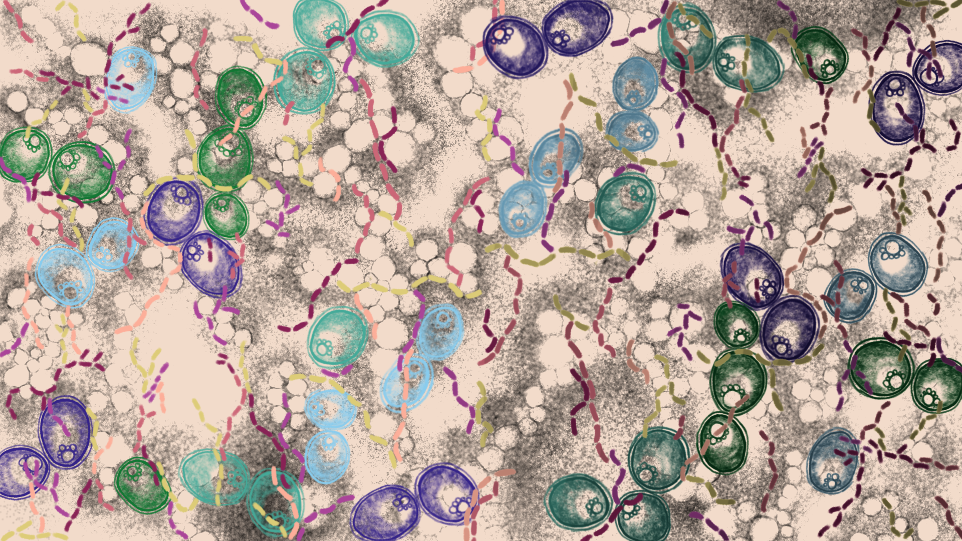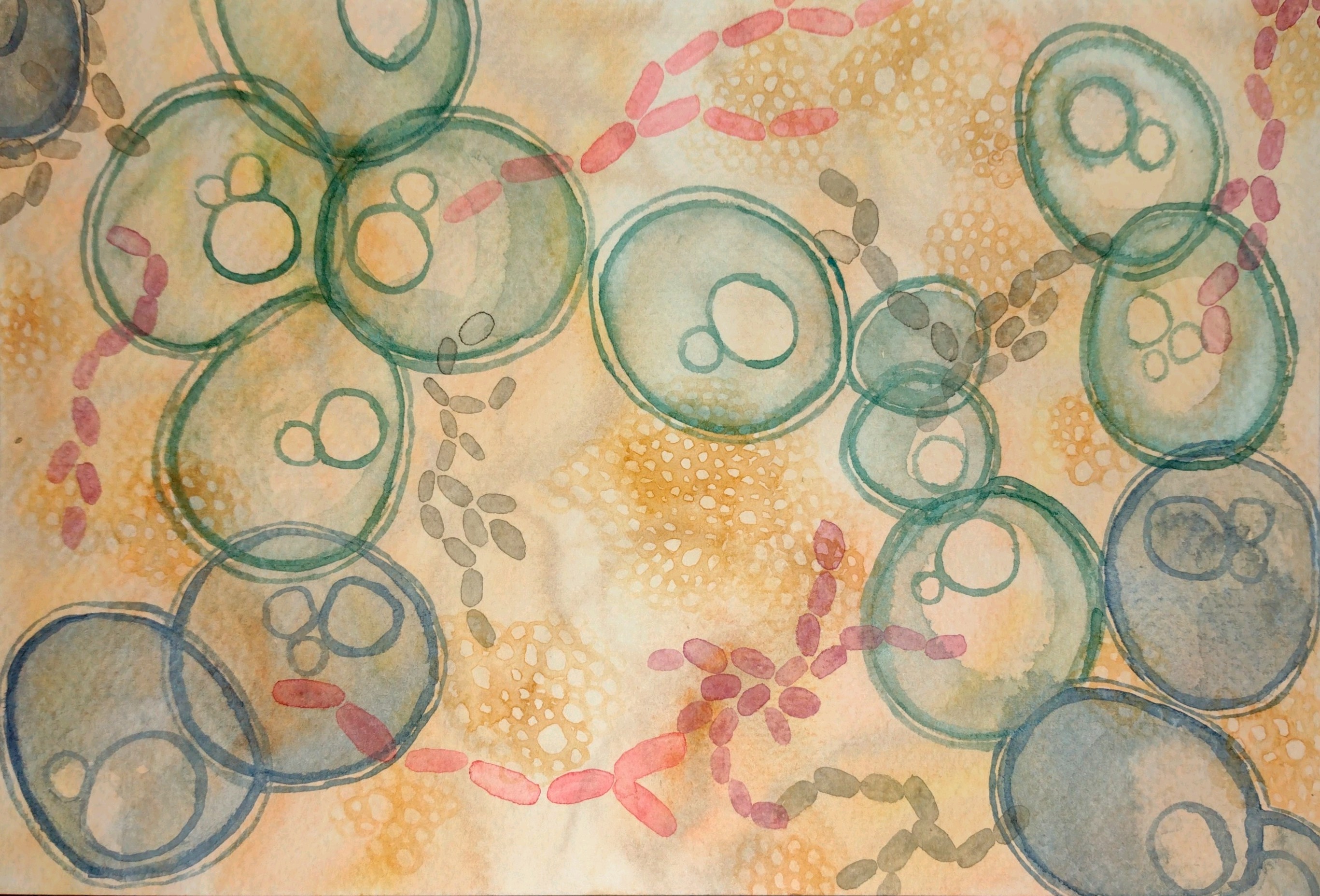 Another piece I made to show the yeast and bacteria from sourdough, digital art made in IbispaintX. This was inspired by a microscopy image I saw in this facebook post!